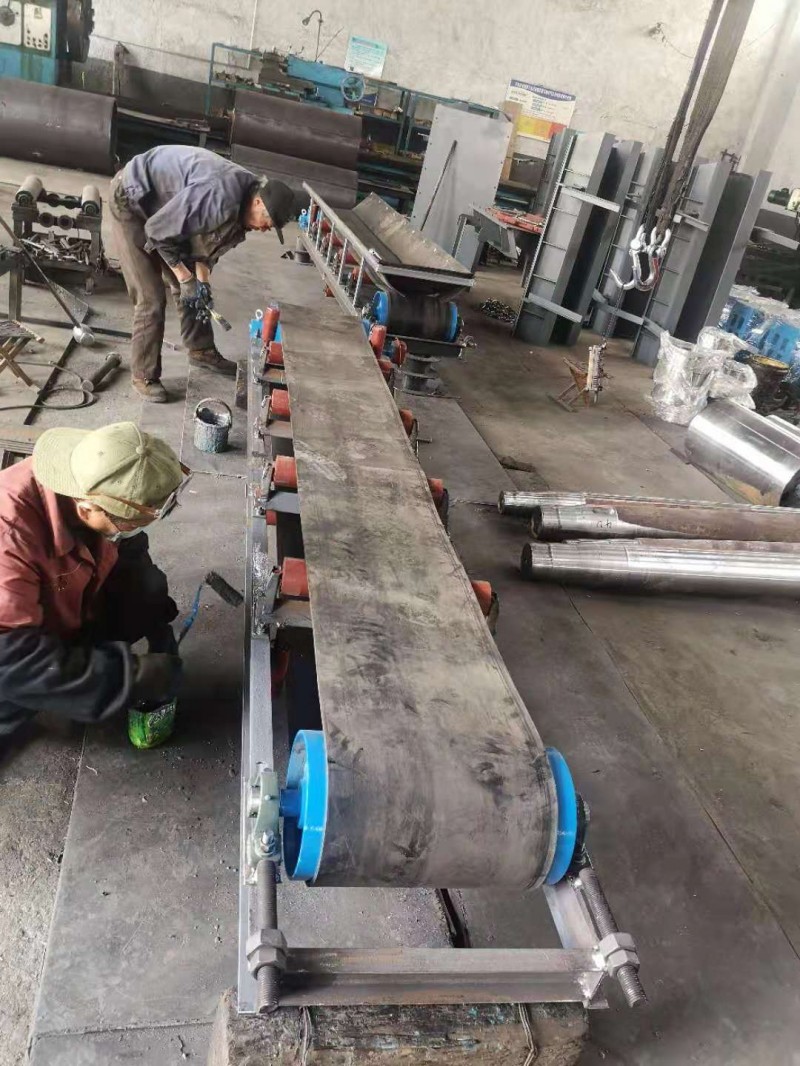 ⑵膠帶與貨載一起在托輥上運行。膠帶既是牽引機構,又是承載機構,貨載與膠帶之間沒有相對運動,消除了運行中膠帶與貨載的摩擦阻力。由于托輥內裝有滾動軸承,膠帶與托輥之間是滾動摩擦,因此運行阻力大大減小,從而減少了功率的消耗,加大了運輸距離。對于一臺膠帶輸送機,其牽引力傳遞能力的大小,決定于膠帶的張力、膠帶在傳動滾筒上的圍包角和膠帶與傳動滾筒之間的摩擦系數(shù)。要保證膠帶輸送機的膠帶在傳動滾筒上不打滑,正常運行,在生產實踐中要根據(jù)不同情況采取相應的措施。提高牽引力的傳遞能力可從以下幾方面入手:
